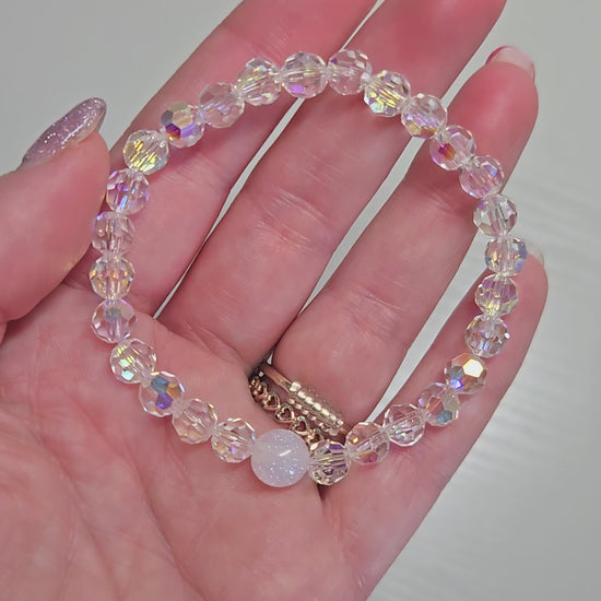 Hand made to order this super sparkly Stretchy Bracelet is made with 6mm Round AB Preciosa Crystals, it looks beautiful from any angle when the light hits it and is finished off with a sparkly 8mm White or Grey Resin Bead in either giving it a bespoke luxury finish.