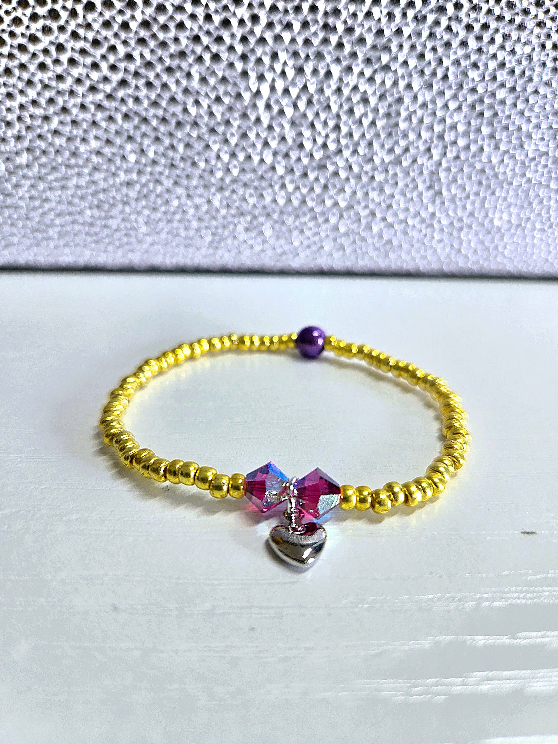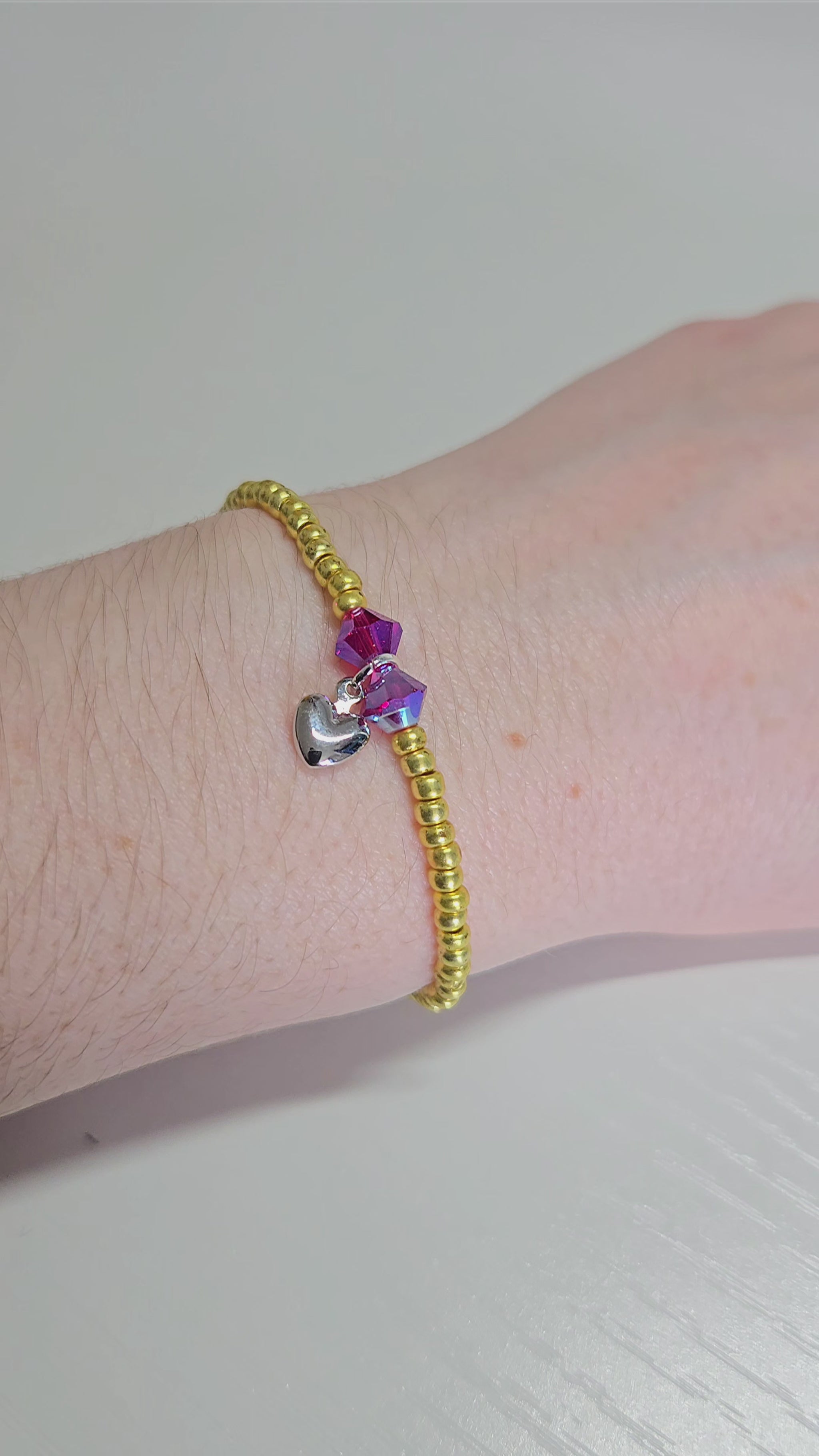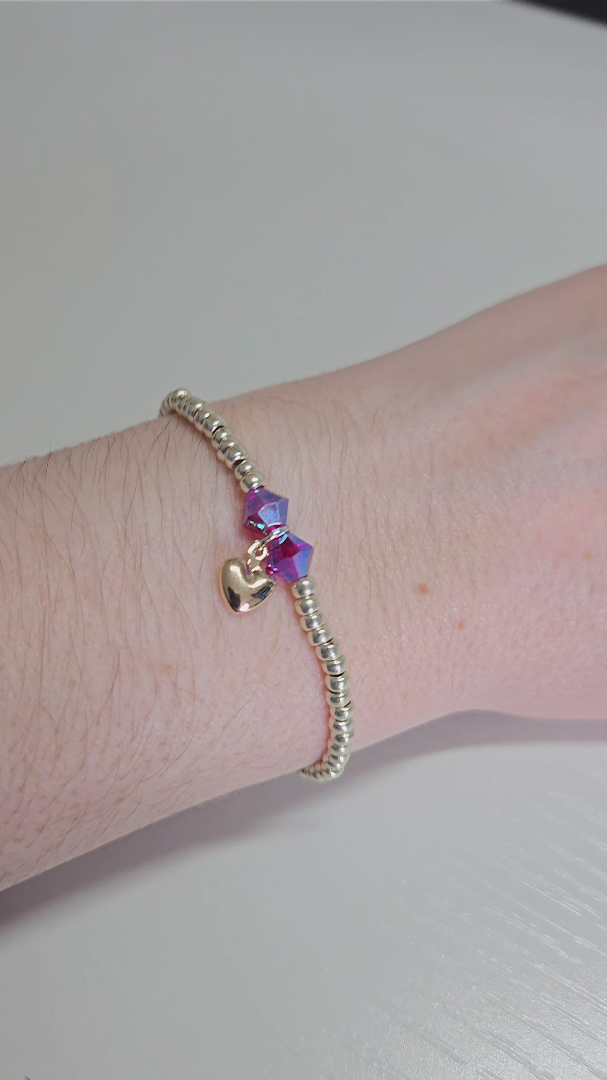 Hand made to order this super sparkly Stretchy Bracelet is made with 3mm Preciosa Crystal Seed Beads, 2 Preciosa Crystals & is finished off with a Metal Heart Charm giving it a bespoke luxury finish.