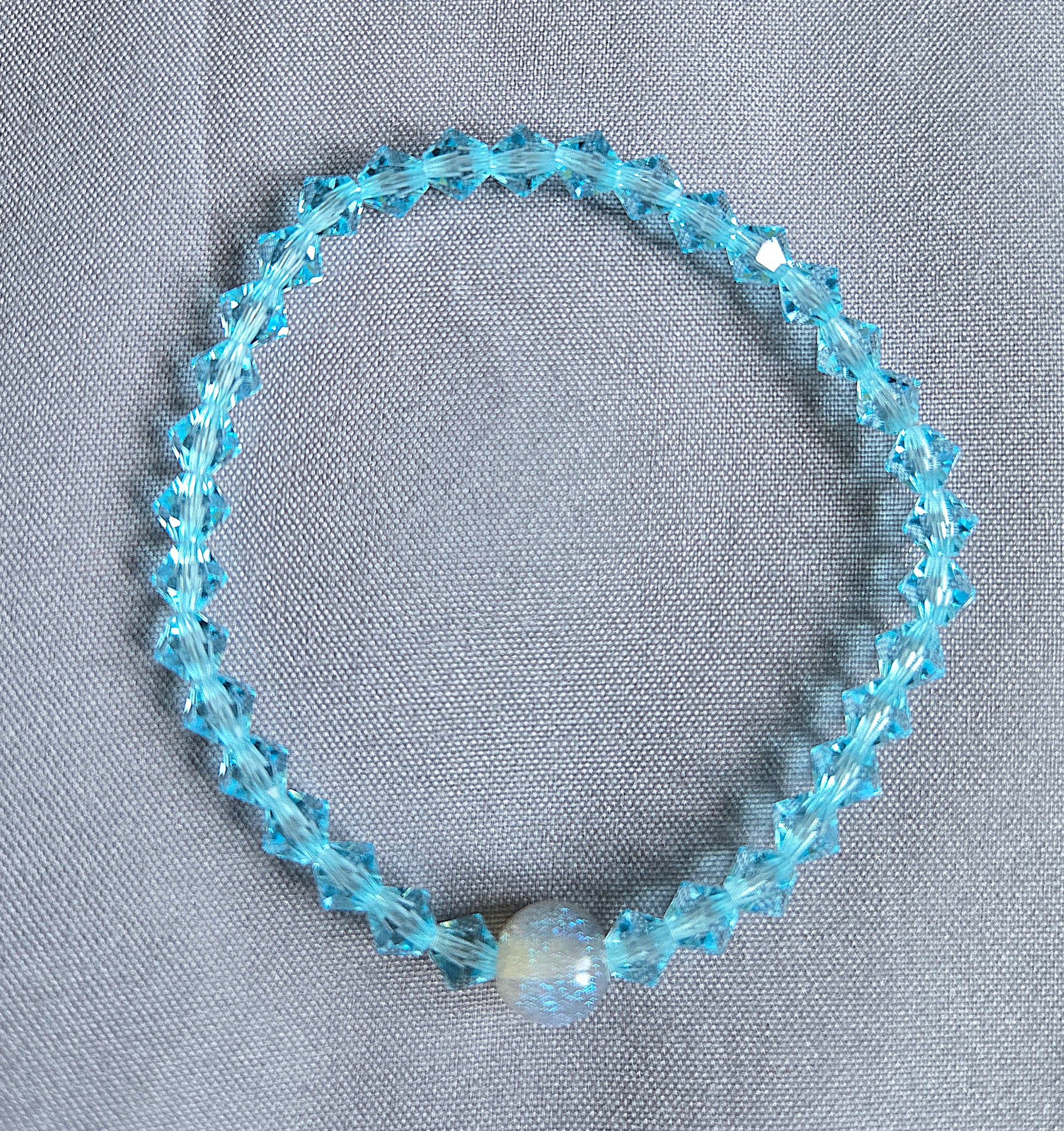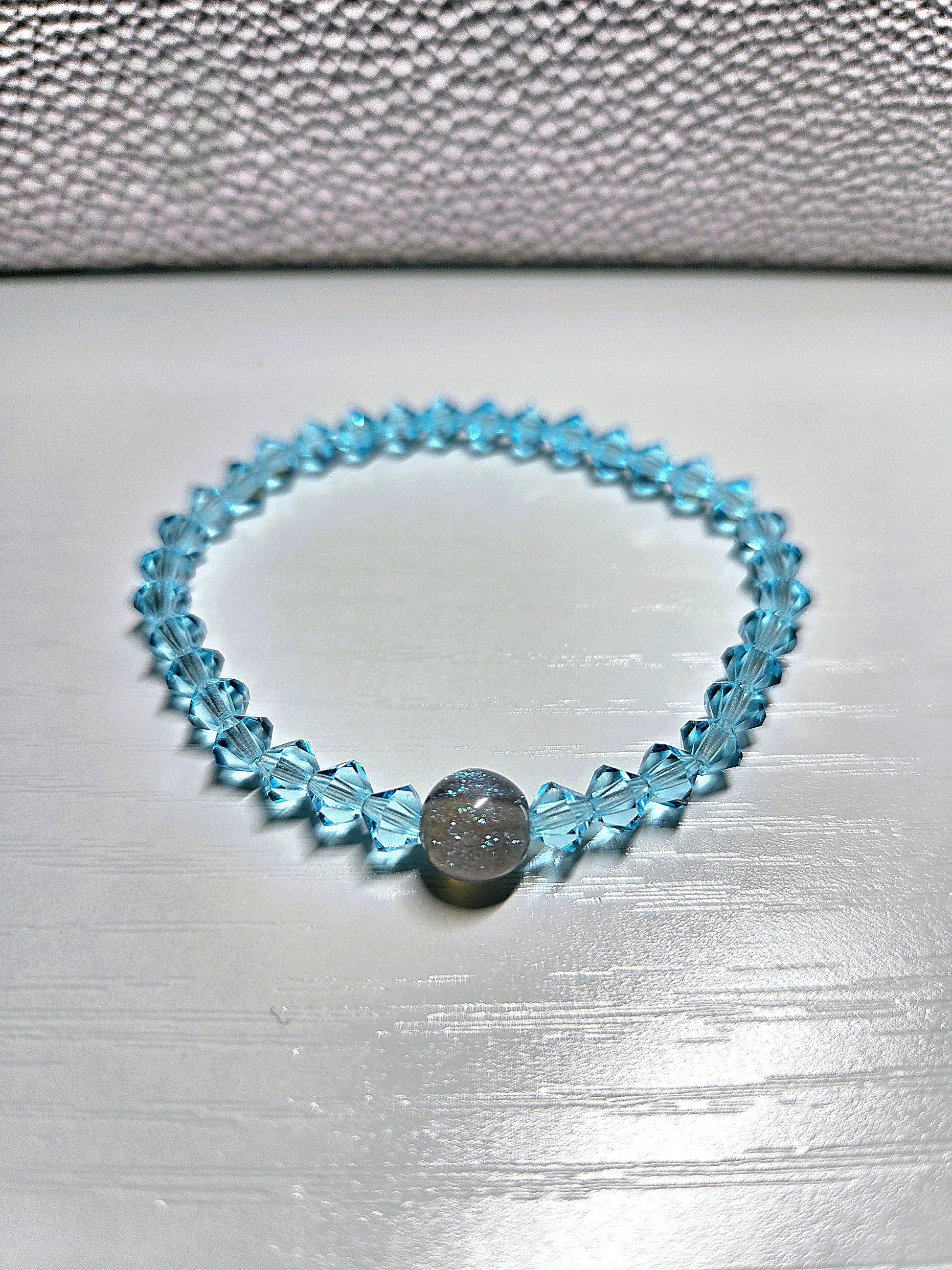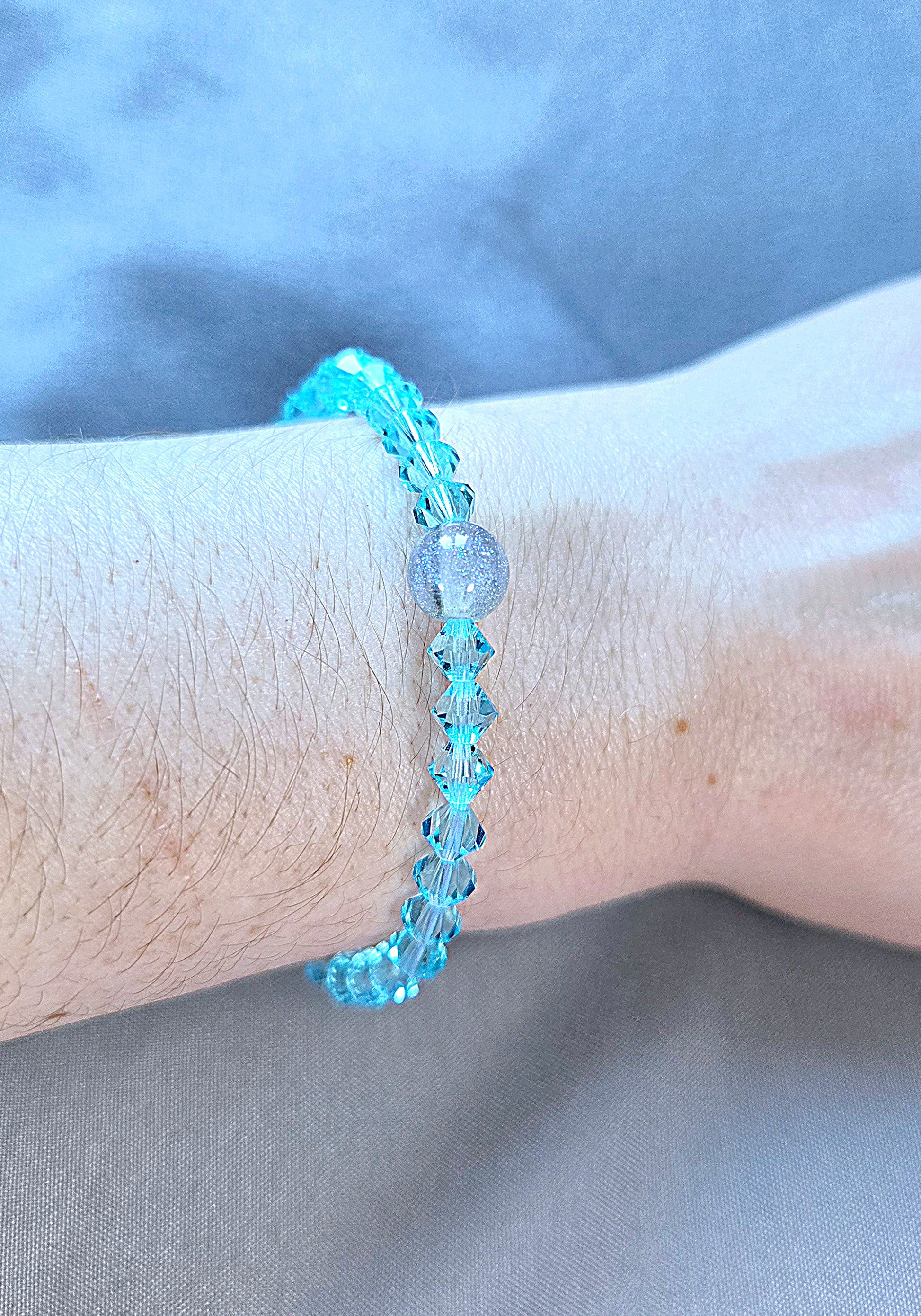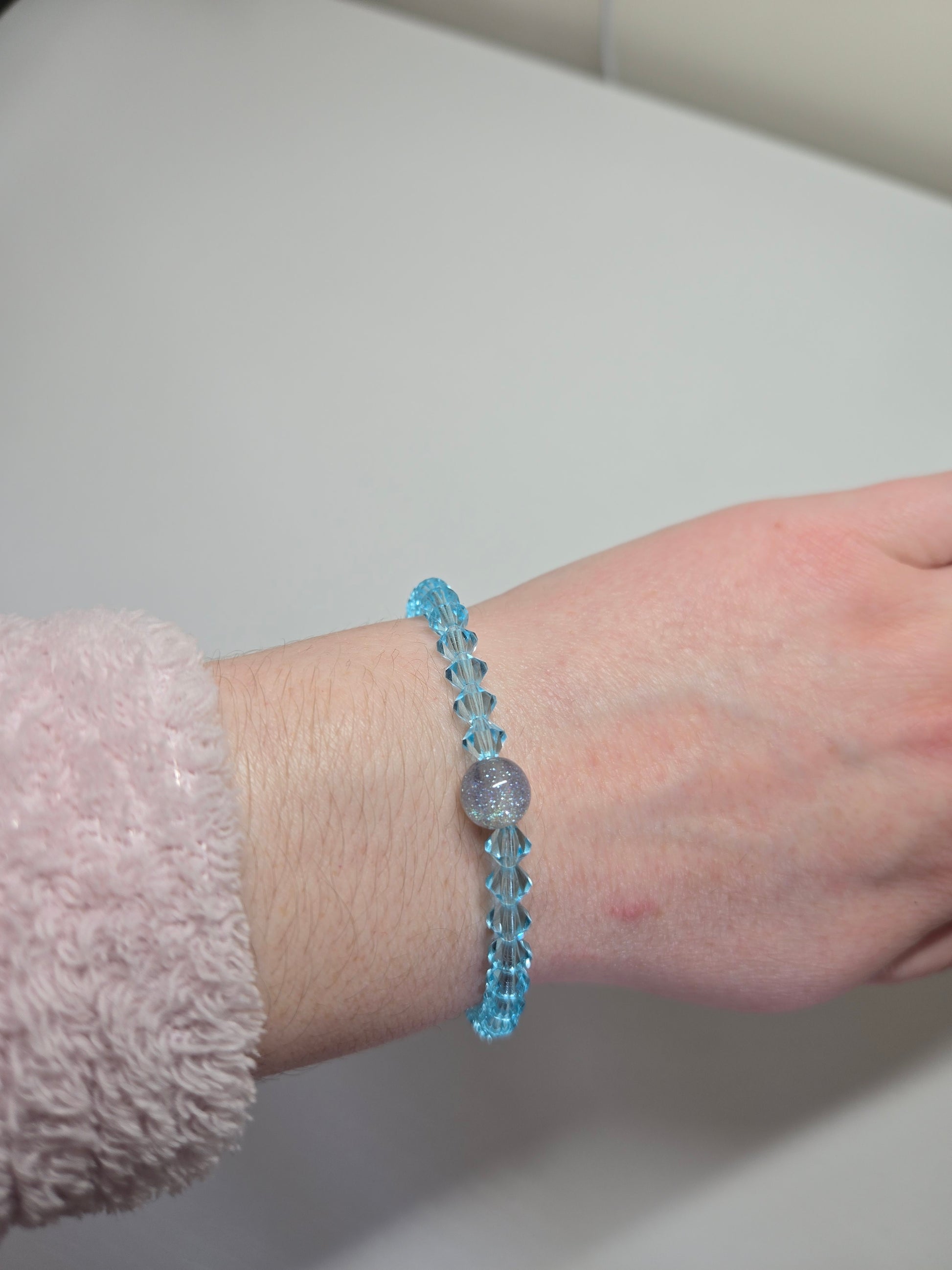 Hand made to order this super sparkly Stretchy Bracelet is made with 6mm Bicone Aqua Bohemica Preciosa Crystals, it looks beautiful from any angle when the light hits it and is finished off with a sparkly 8mm Blue or Grey Resin Bead giving it a bespoke luxury finish.