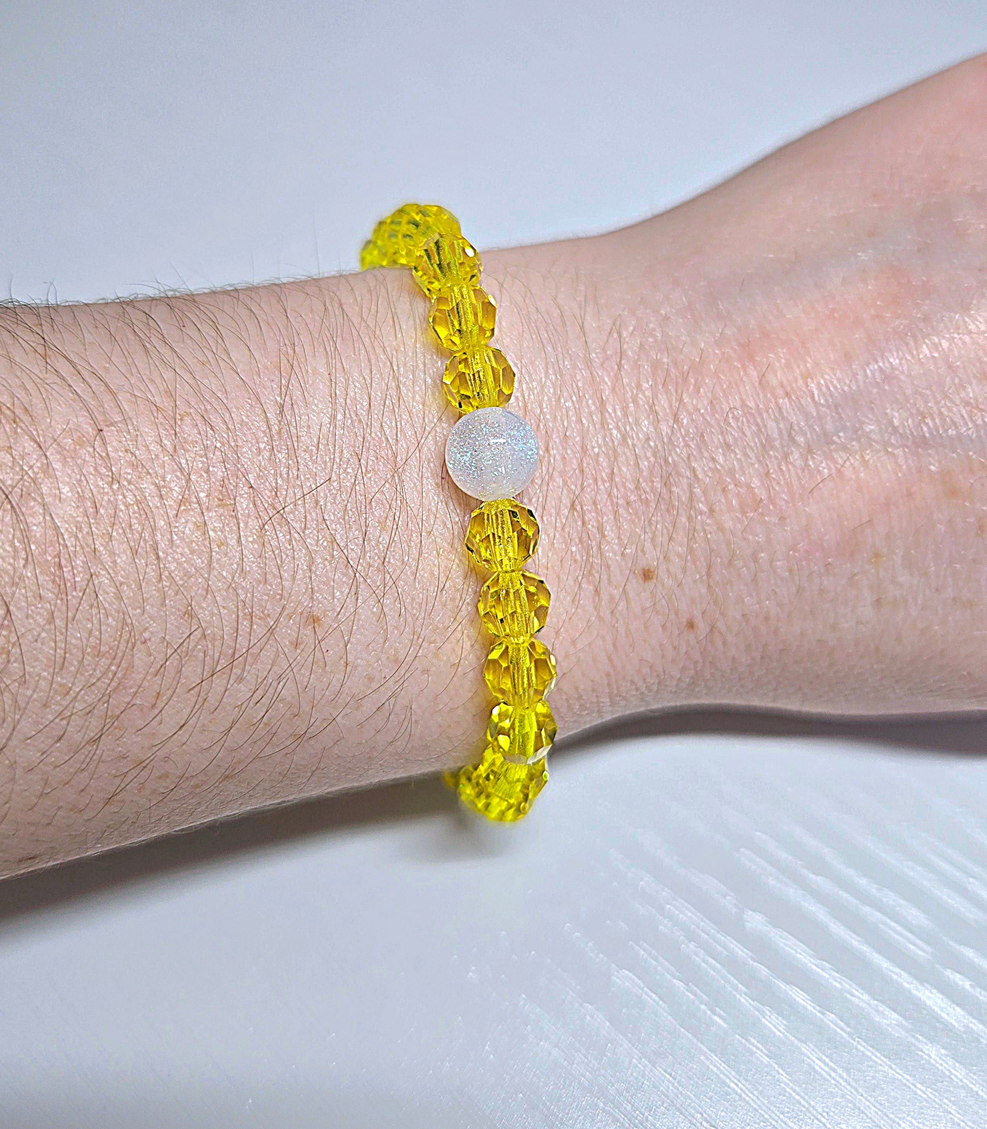 Hand made to order this super sparkly Stretchy Bracelet is made with 6mm Round Yellow Citrine Preciosa Crystals, it looks beautiful from any angle when the light hits it and is finished off with a sparkly 8mm Resin Bead giving it a bespoke luxury finish.